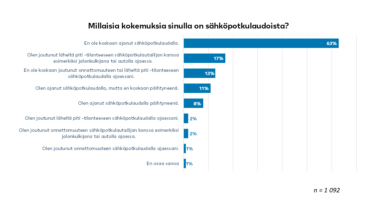– Jos tarkastellaan vain niitä vastaajia, joilla ylipäätään on kokemuksia sähköpotkulaudalla ajamisesta, heistä reilu viidesosa kertoo ajaneensa joskus päihtyneenä. Voi kuitenkin hyvin olla, että humalassa ajaminen on yleisempää kuin vastaajat suoraan myöntävät, sillä vain 11 prosenttia kertoi, ettei ole koskaan ajanut sähköpotkulaudalla päihtyneenä.