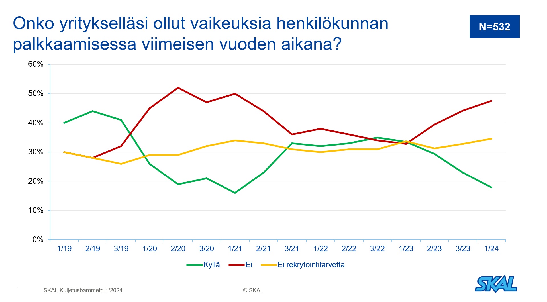 Lähes puolet vastanneista (47 %) prosenttia kertoo, että kuljetusyrityksellä ei ole ollut vaikeuksia henkilökunnan palkkaamisessa viimeisen vuoden aikana (33 % 2023). Rekrytointivaikeuksista puolestaan kertoo 18 prosenttia vastanneista (33 % 2023). Lopuilla ei ole rekrytointitarvetta. Tilanne on kuitenkin väliaikainen ja taloustilanteen parantuessa ongelma työvoiman saatavuudesta palaa entistä pahempana. On myös syytä muistaa, että uuden kuljettajan kouluttaminen vie aikaa.