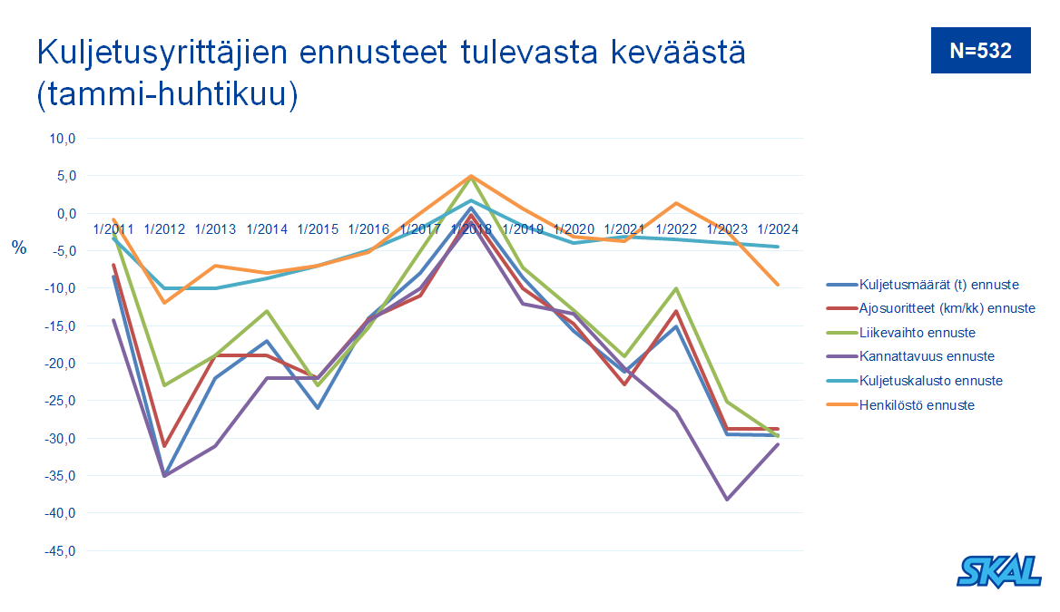 SKAL Kuljetusbarometri 1/2024: Kuljetuskustannuksia hillitsevät päätökset kohentavat kuljetusalan kannattavuutta, työvoiman tarve vähenemässä