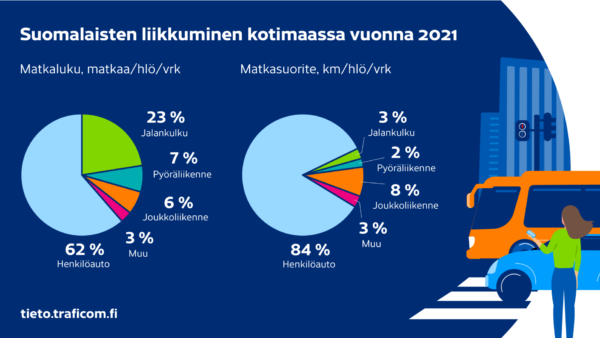 Koronapandemian vaikutukset suomalaisten liikkumiseen näkyivät matkojen määrissä ja pituuksissa selvästi. Suomalainen valitsee edelleen mieluiten henkilöauton liikkumiseen, seuraavaksi eniten kuljetaan jalan. Tiedot selviävät Liikenne- ja viestintävirasto Traficomin julkaisemasta säännöllisesti toteutettavasta valtakunnallisesta henkilöliikennetutkimuksesta, joka kartoitti viimeisimpänä suomalaisten liikkumistottumuksia vuonna 2021. Lisääntyneen etätyön vaikutus liikkumisen kokonaismäärään oli kuitenkin pieni.